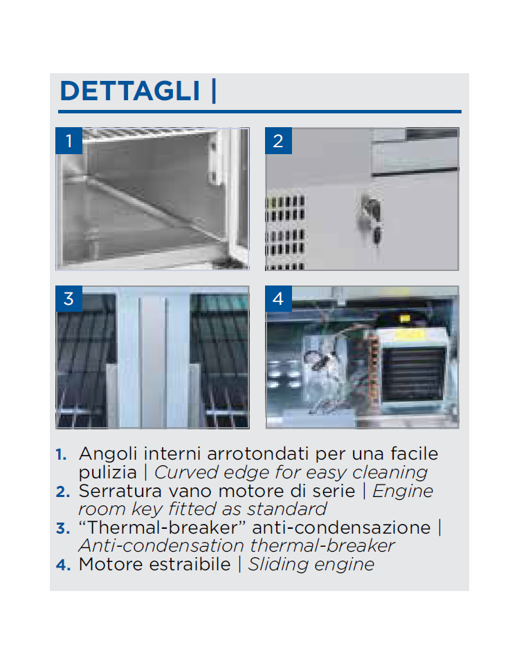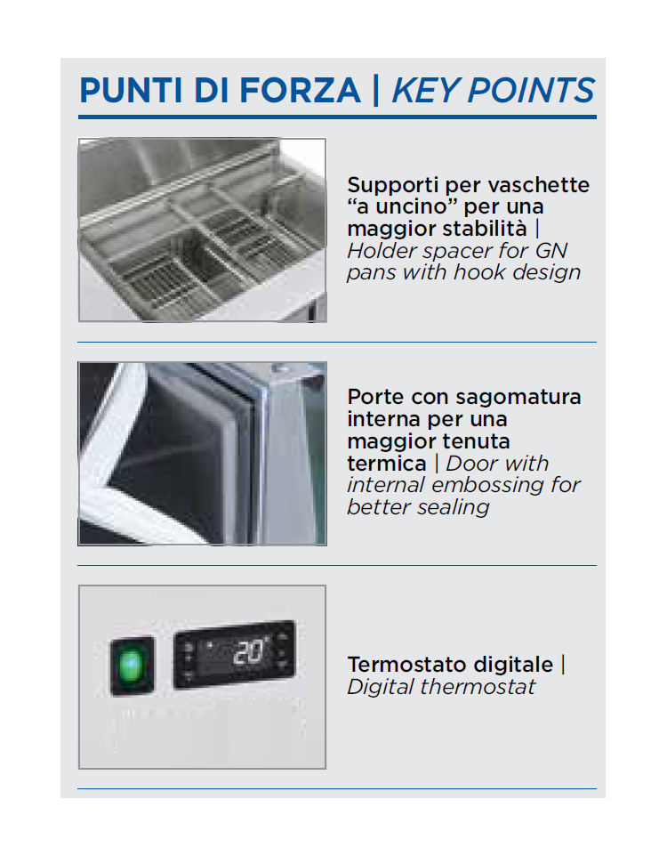 Design pulito ed essenziale per questa saladette con due porte, top aperto con coperchio richiudibile in acciaio Inox, caratteristiche che la rendono un’attrezzatura professionale refrigerata solida e facilmente adattabile a tutti gli ambienti. La saudette rappresenta il perfetto esempio di adattabilità e funzionalità, grazie alla doppia porta, ripiani regolabili GN1/1, top adatto a contenere vaschette GN da 150mm di altezza, coperchio richiudibile e termostato digitale. Il motore scorrevole posizionato nella parte bassa del corpo ed il filtro del condensatore facilmente removibile, sono stati pensati per agevolare qualsiasi intervento di manutenzione e di assistenza.