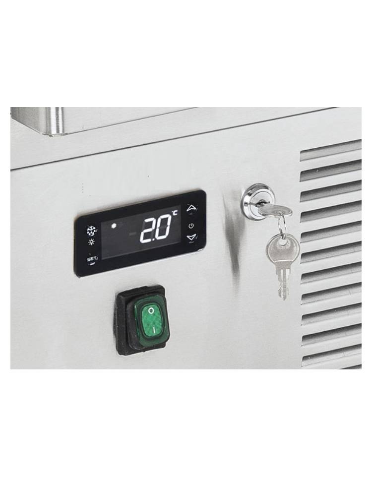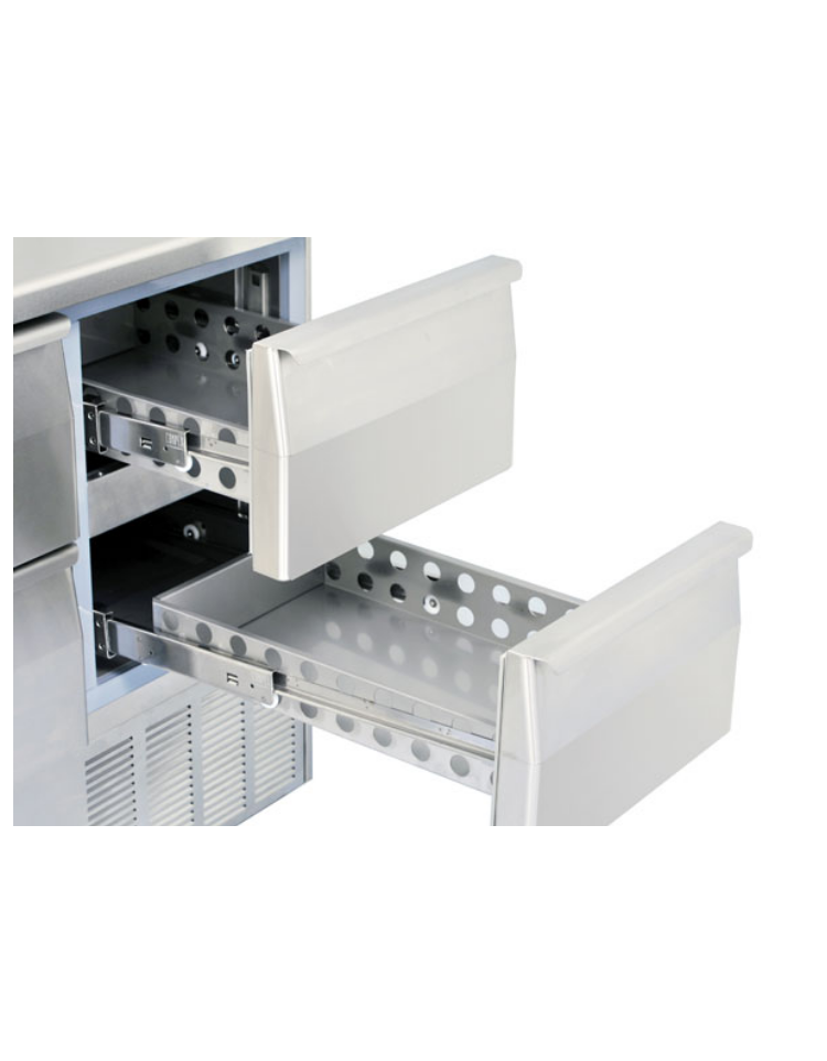 Design pulito ed essenziale per questa saladette con due cassetti refrigerati e con piano in acciaio Inox, caratteristiche che la rendono una attrezzatura professionale refrigerata solida e facilmente adattabile agli ambienti meno spaziosi. Rappresenta il perfetto esempio di adattabilità e funzionalità, grazie ai due cassetti con guide telescopiche adatti a contenere vaschette GN1/1 da 150 mm di altezza e termostato digitale. Il motore scorrevole posizionato nella parte bassa del corpo ed il filtro del condensatore facilmente removibile, sono stati pensati per agevolare qualsisi intervento di manutenzione e di assistenza.