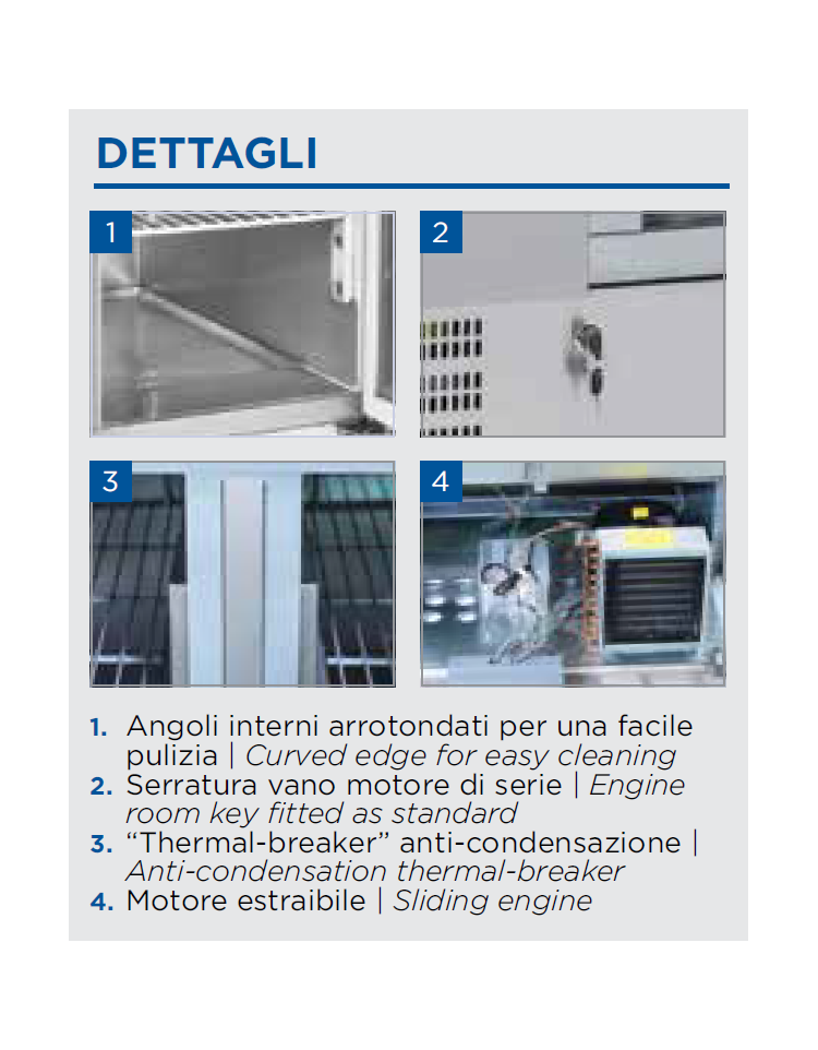 Design pulito ed essenziale per questa saladette con due porte e top aperto con protezione in vetro, caratteristiche che la rendono un’attrezzatura professionale refrigerata solida e facilmente adattabile a tutti gli ambienti. La saladette rappresenta il perfetto esempio di adattabilità e funzionalità, grazie alla doppia porta, ripiani regolabili GN1/1, top adatto a contenere vaschette GN da 150mm di altezza, protezione in vetro e termostato digitale. Il motore scorrevole posizionato nella parte bassa del corpo ed il filtro del condensatore facilmente removibile, sono stati pensati per agevolare qualsiasi intervento di manutenzione e di assistenza.