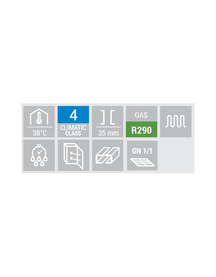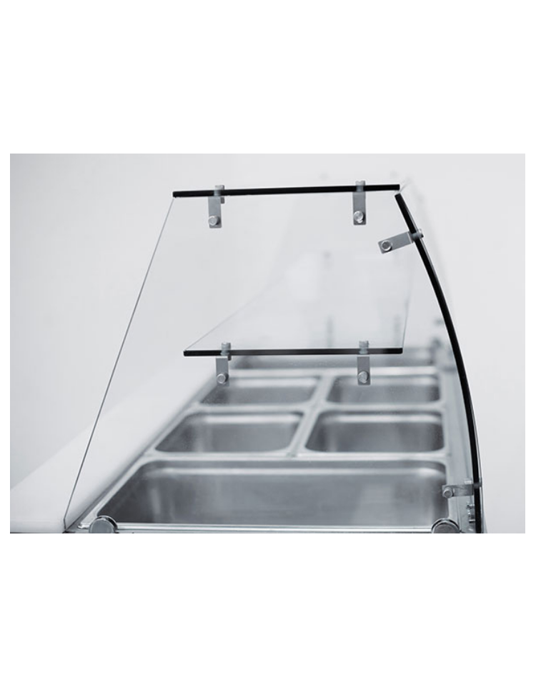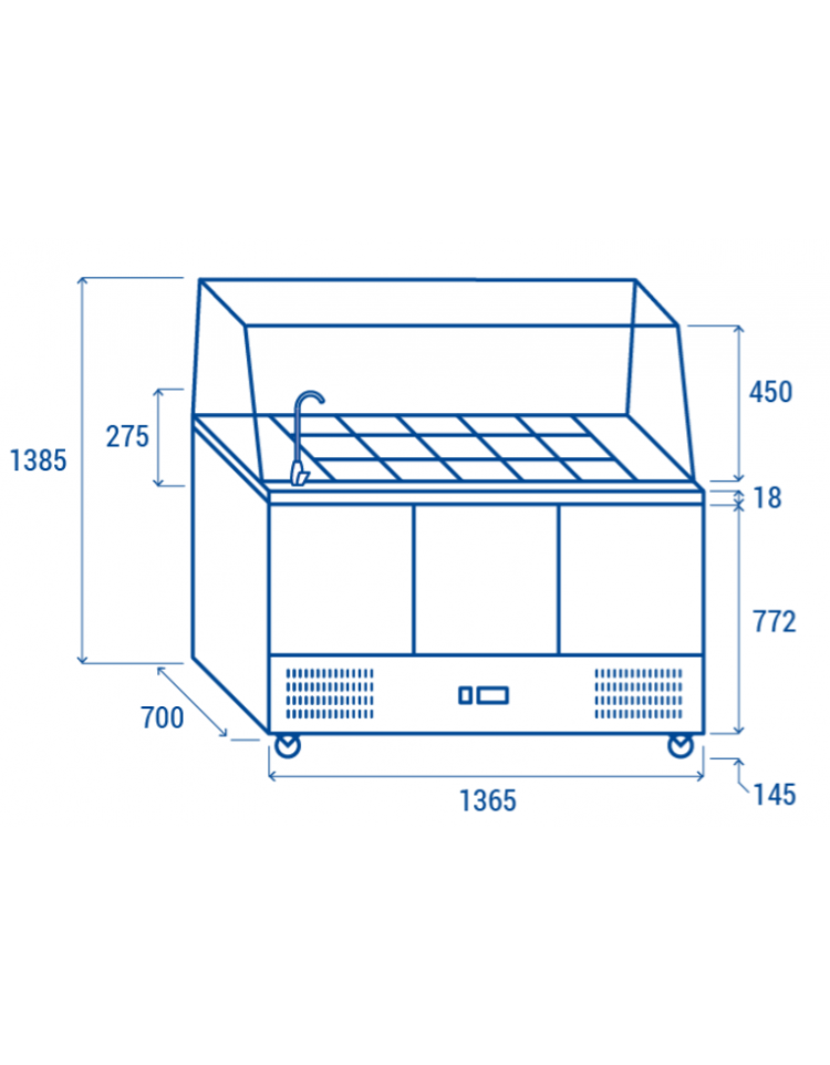 Dall’aspetto pulito ed essenziale, questo modello con top aperto e protezione in vetro è perfetto per risparmiare spazio e offrire una postazione di lavoro refrigerata in qualsiasi cucina professionale. Dotato di rubinetto in acciaio inox e 15 vaschette (GN1/6 in PVC), un perfetto esempio di efficienza, due porte, un ripiano regolabile GN1/1 + 2 taniche foodgrade, termostato digitale, vano motore nella parte bassa, un filtro condensatore facilmente rimovibile per agevolare manutenzione e pulizia.