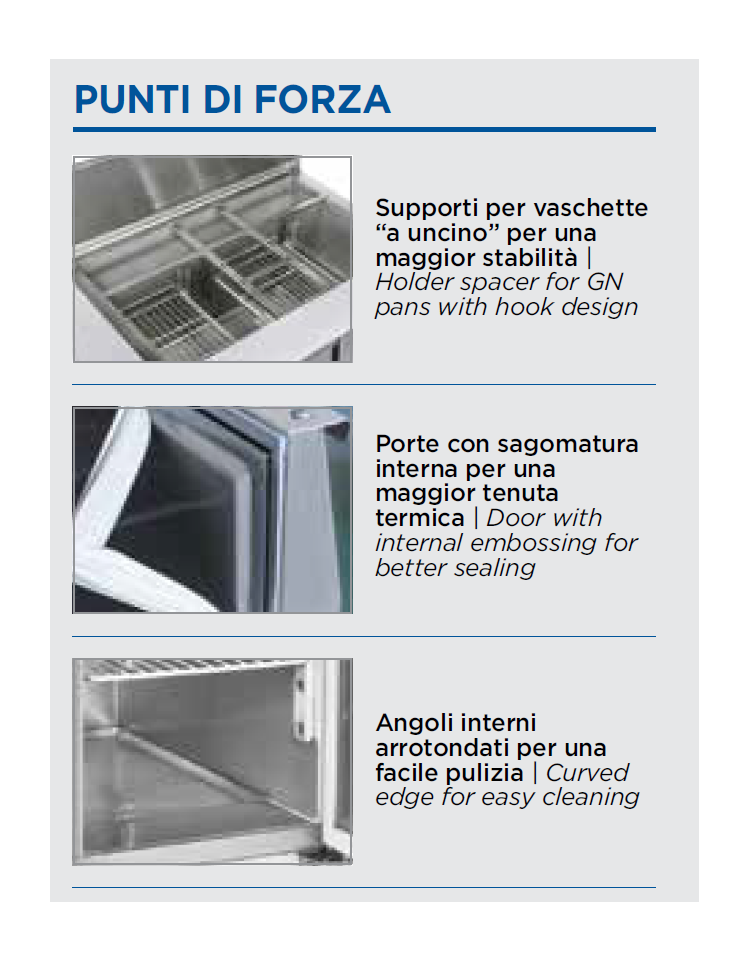 Design pulito ed essenziale per questa saladette con tre porte e top aperto con protezione in vetro, caratteristiche che la rendono un’attrezzatura professionale refrigerata solida e facilmente adattabile a tutti gli ambienti. La saladette rappresenta il perfetto esempio di adattabilità e funzionalità, grazie alla tripla porta, ripiani regolabili GN1/1, top adatto a contenere vaschette GN da 150mm di altezza, protezione in vetro e termostato digitale. Il motore scorrevole posizionato nella parte bassa del corpo ed il filtro del condensatore facilmente removibile, sono stati pensati per agevolare qualsiasi intervento di manutenzione e di assistenza.