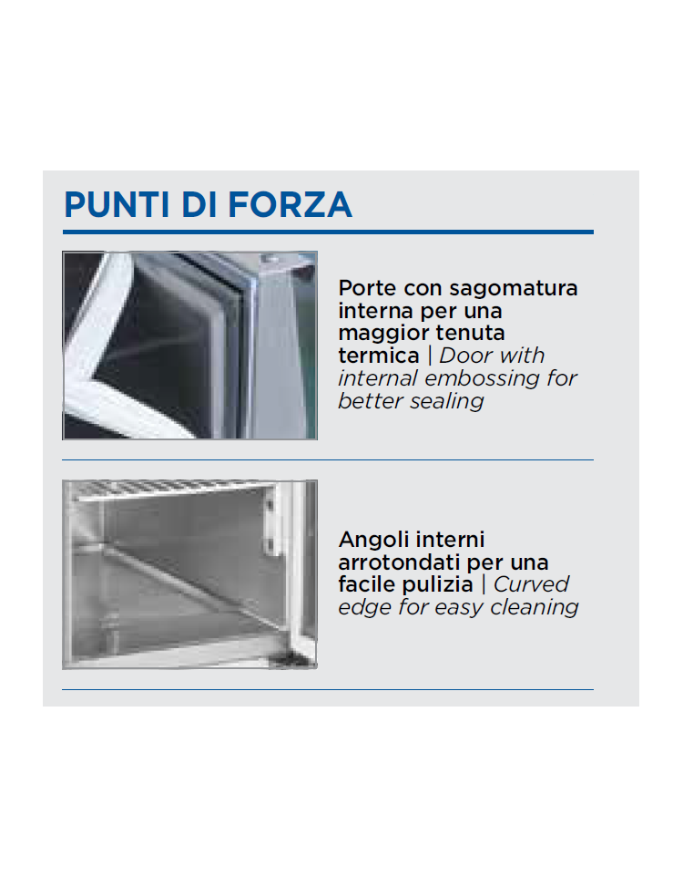Progettata per offrire un piano di lavoro solido e affidabile, questa saladette offre top in acciaio inox con un vano che può contenere fino a 8 vaschette GN1/6, e rappresenta una soluzione facilmente adattabile a tutti gli ambienti. La saladette è il perfetto esempio di adattabilità e funzionalità, grazie alla doppia porta, ripiani regolabili GN1/1, top con ripiano richiudibile adatto a contenere vaschette GN1/6 da 150mm di altezza e termostato digitale. Il motore scorrevole posizionato nella parte bassa del corpo e il filtro del condensatore facilmente removibile, sono stati pensati per agevolare qualsiasi intervento di manutenzione e di assistenza.