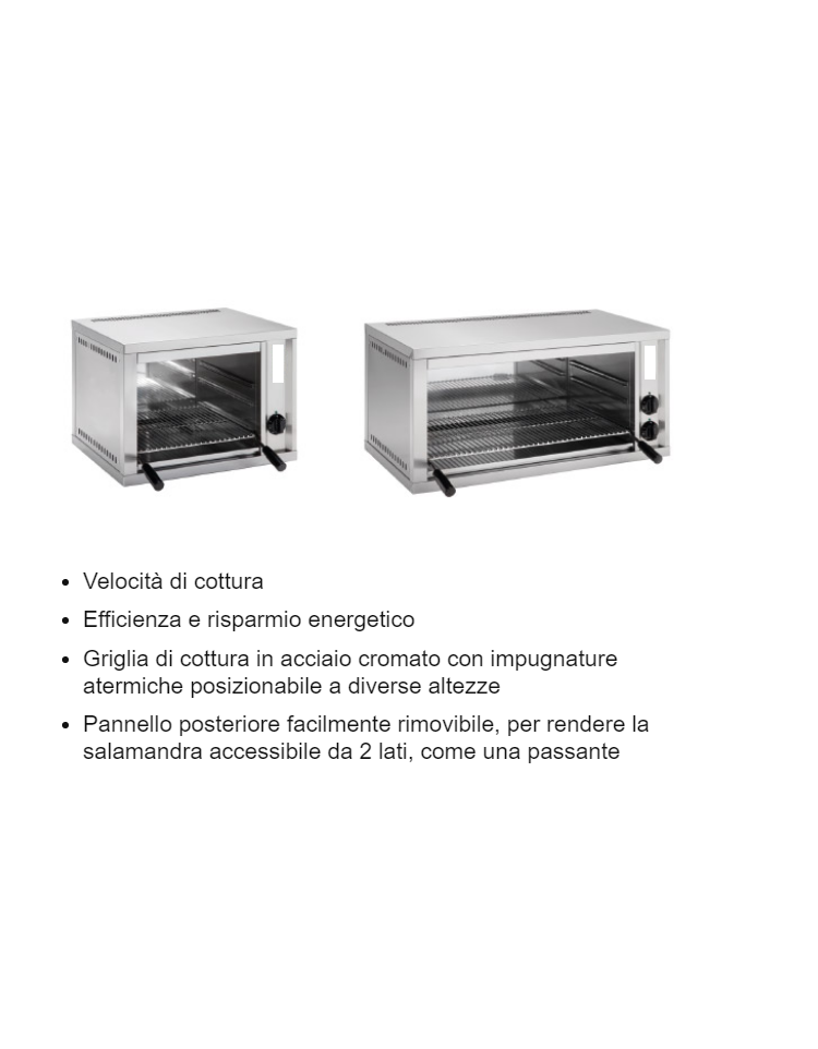 Estremamente versatili, le salamandre sono apparecchiature particolarmente adatte alla gratinatura, ma si prestano anche alla cottura vera e propria, nonché al mantenimento in temperatura.