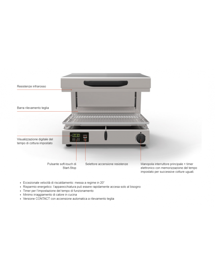 Salamandra elettrica ultrarapida con piano mobile, superficie di cottura cm 40x35 - potenza tot. Kw 2 monofase - cm 40x54,8x50h
