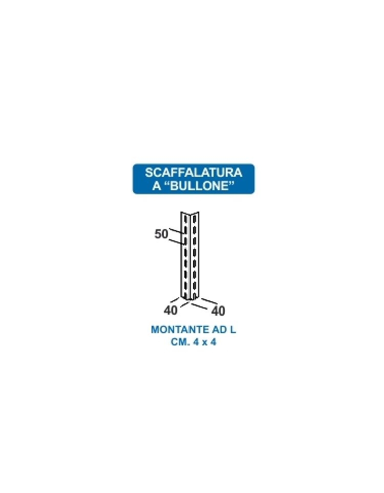La sezione delle barre è a lati uguali di mm. 40x40. Sui lati degli angolari sono state praticate file di asole mm. 9 con passo mm. 50. Per il congiungimento ai ripiani mediante bulloni.