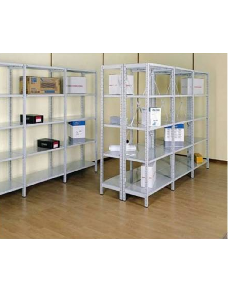I montanti sono realizzati in lamiera d'acciaio laminata a freddo tipo DC01/Fe e P01 norma UNI EN 10130 spessore mm. 12/10 a sezione a “C” semichiusa, dimensioni mm. 50x32x50, sono asolati sui lati lunghi, dimensioni mm. 3x20 con passo mm. 50. I ganci porta ripiano sono ricavati da nastri zincati spessore mm. 15/10 tipo sendzimir DX51DFe P02G a norme UNI EN 10142/92 e 10147. Le traversine sono realizzate in lamiera d'acciaio mm. 12/10, si agganciano ai montanti formando fiancate con profondità uguale a quella dei ripiani utilizzati per ogni scaffale. Il numero delle traverse varia in conseguenza dell'altezza dei montanti in modo che l'intera struttura abbia la massima rigidità. Le basi in materiale plastico sagomato come la sezione del montante si adattano ad esso perfettamente e contribuiscono alla distribuzione del carico al pavimento.