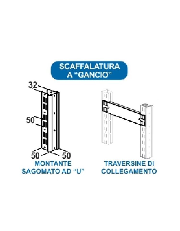 I montanti sono realizzati in lamiera d'acciaio laminata a freddo tipo DC01/Fe e P01 norma UNI EN 10130 spessore mm. 12/10 a sezione a “C” semichiusa, dimensioni mm. 50x32x50, sono asolati sui lati lunghi, dimensioni mm. 3x20 con passo mm. 50. I ganci porta ripiano sono ricavati da nastri zincati spessore mm. 15/10 tipo sendzimir DX51DFe P02G a norme UNI EN 10142/92 e 10147. Le traversine sono realizzate in lamiera d'acciaio mm. 12/10, si agganciano ai montanti formando fiancate con profondità uguale a quella dei ripiani utilizzati per ogni scaffale. Il numero delle traverse varia in conseguenza dell'altezza dei montanti in modo che l'intera struttura abbia la massima rigidità. Le basi in materiale plastico sagomato come la sezione del montante si adattano ad esso perfettamente e contribuiscono alla distribuzione del carico al pavimento.