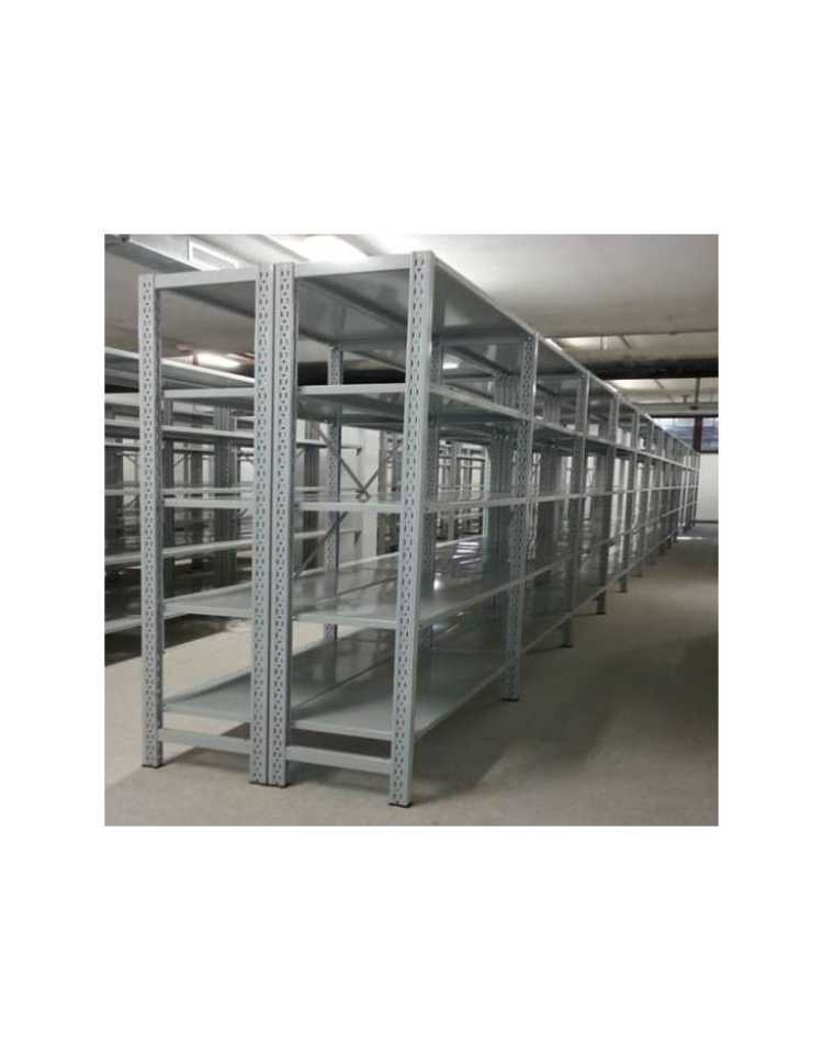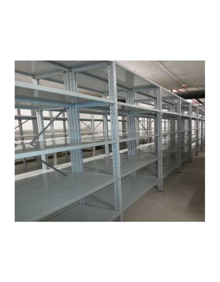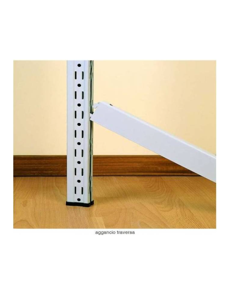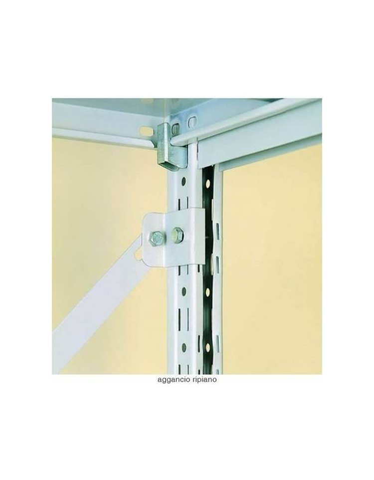 I montanti sono realizzati in lamiera d'acciaio laminata a freddo tipo DC01/Fe e P01 norma UNI EN 10130 spessore mm. 12/10 a sezione a “C” semichiusa, dimensioni mm. 50x32x50, sono asolati sui lati lunghi, dimensioni mm. 3x20 con passo mm. 50. I ganci porta ripiano sono ricavati da nastri zincati spessore mm. 15/10 tipo sendzimir DX51DFe P02G a norme UNI EN 10142/92 e 10147. Le traversine sono realizzate in lamiera d'acciaio mm. 12/10, si agganciano ai montanti formando fiancate con profondità uguale a quella dei ripiani utilizzati per ogni scaffale. Il numero delle traverse varia in conseguenza dell'altezza dei montanti in modo che l'intera struttura abbia la massima rigidità. Le basi in materiale plastico sagomato come la sezione del montante si adattano ad esso perfettamente e contribuiscono alla distribuzione del carico al pavimento.