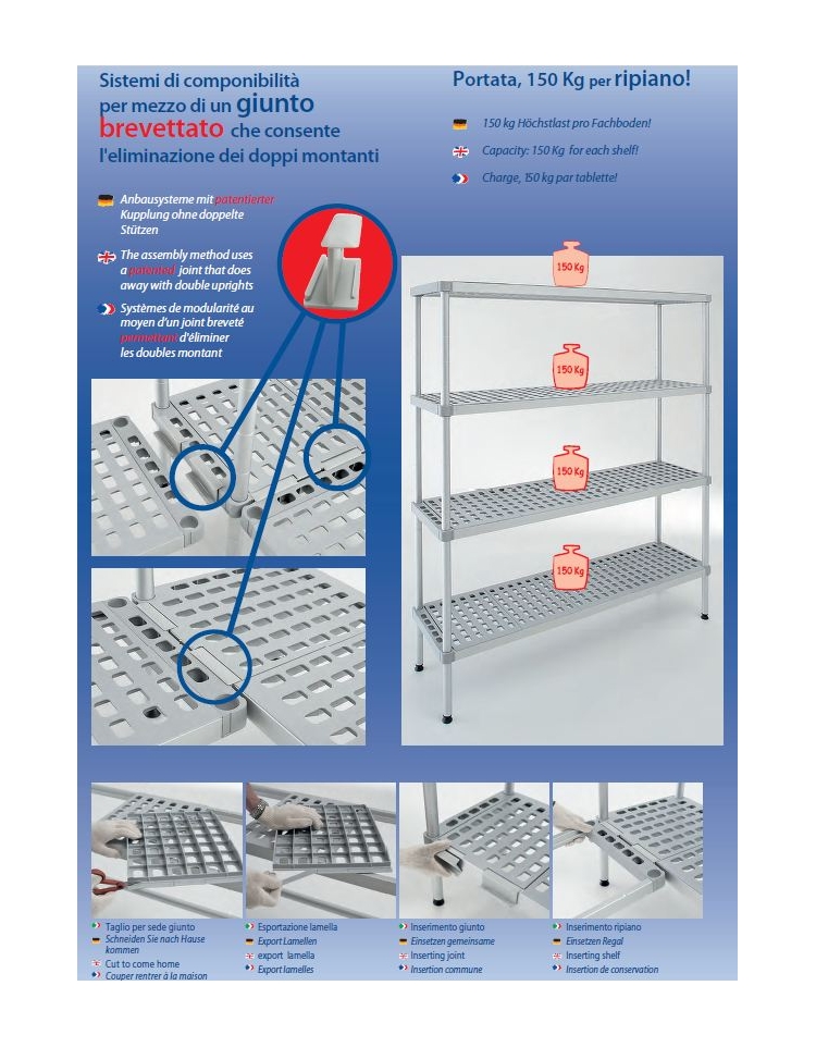 Struttura in acciaio inox AISI 304 con ripiani in polipropilene. Lo scaffale è un prodotto facile da assemblare senza alcuna vite né saldatura, veloce nella pulizia, stabile, con portata di 150 kg. ogni ripiano uniformemente distribuiti. È possibile fissare i ripiani ogni 10 cm e quindi scegliere il numero di ripiani che compongono ogni scaffale. Grazie all’aggancio di unione brevettato (cod. ARA), lo scaffale è estremamente versatile nella composizione di strutture modulari composte da più elementi. Per composizioni lineari, oppure ad L o ad U, si usano due agganci per ogni ripiano da unire e così si risparmiano due montanti ogni unione, ottenendo un minor costo, maggior spazio disponibile pur mantenendo inalterata la capacità di carico. Le dimensioni disponibili sono: altezza 1600, 1800, 2000 mm con o senza ruote; profondità 300, 400, 500, 600 mm; lunghezze da L. 600 a 2000 mm.