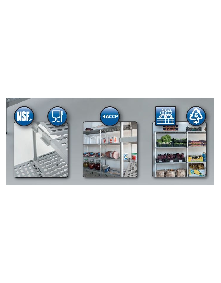 Lo scaffale ha ottenuto la certificazione per uso alimentare marchio NSF e può essere utilizzato in diversi ambienti tra i quali cucine, depositi e celle frigo a temperature fino a –40°.