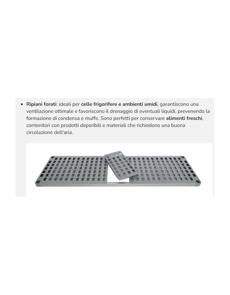 Ripiani forati: ideali per celle frigorifere e ambienti umidi, garantiscono una ventilazione ottimale e favoriscono il drenaggio di eventuali liquidi, prevenendo la formazione di condensa e muffe. Sono perfetti per conservare alimenti freschi, contenitori con prodotti deperibili e materiali che richiedono una buona circolazione dell'aria.