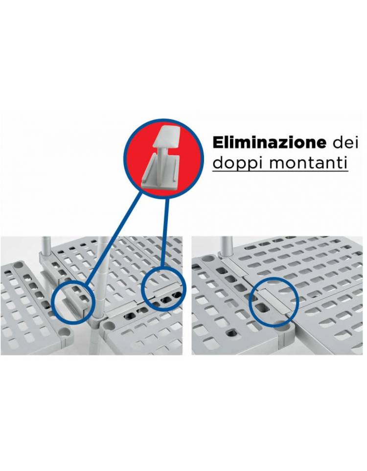 La creazione di scaffalature composite è molto rapida perché non necessita di doppi montanti: l'esclusivo giunto brevettato consente di collegare in ogni posizione scaffali adiacenti senza altri montanti in alluminio. Il nuovo giunto brevettato permette di risparmiare spazio ottenendo strutture resistenti esattamente quanto uno scaffale con 4 montanti.