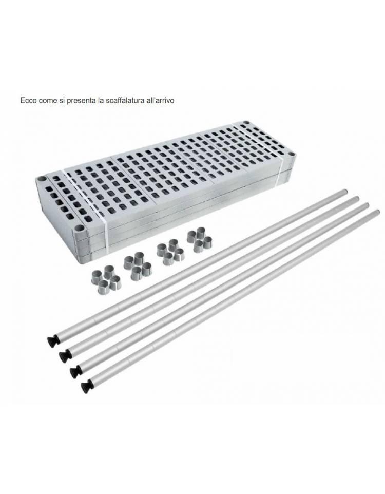 Scaffale in allumino a montaggio rapido ad incastro, composto da montanti in tubo alluminio Ø 35 mm,