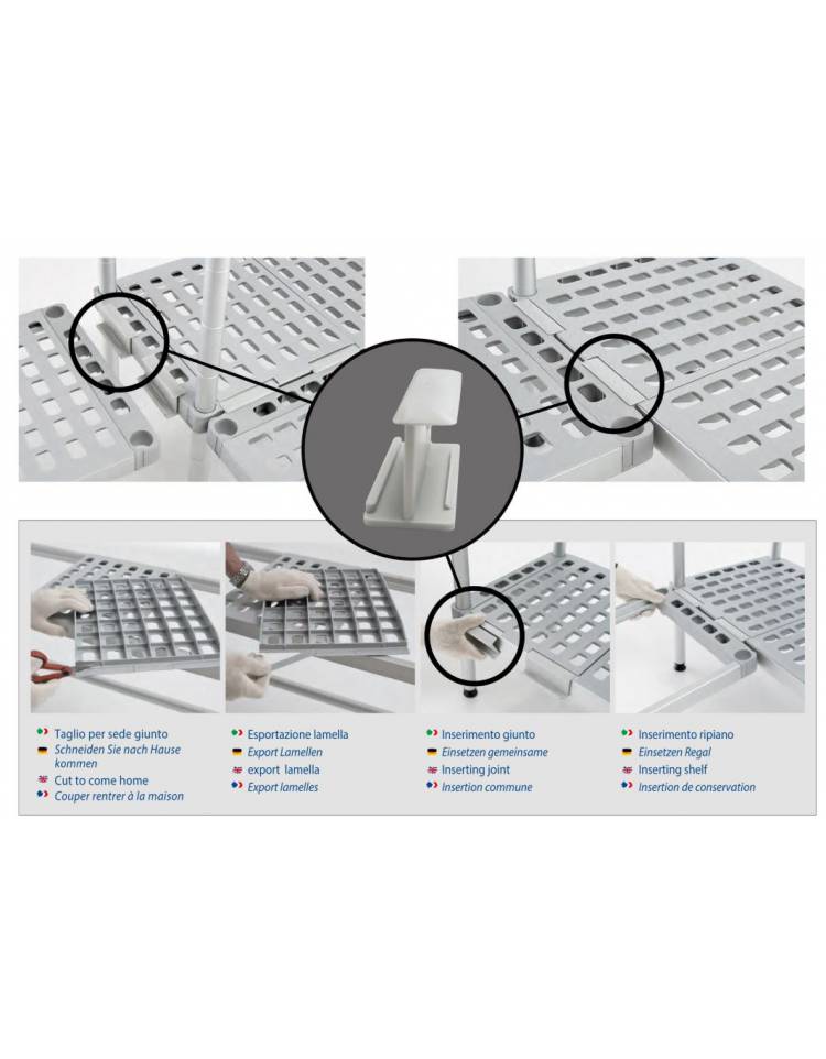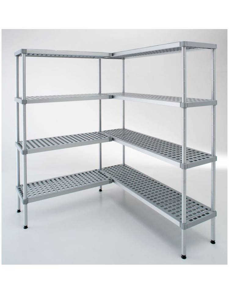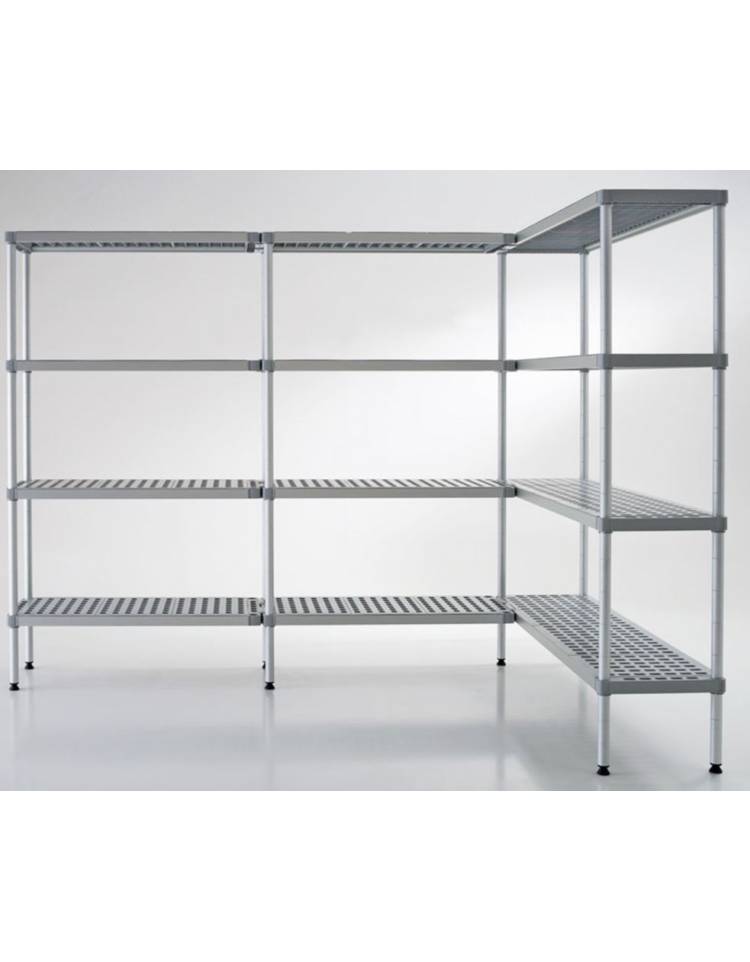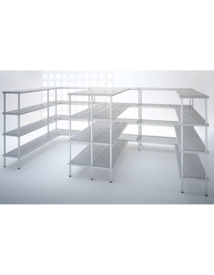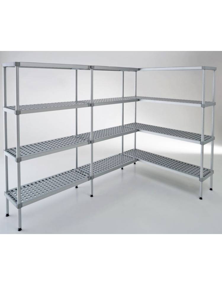 Gli scaffali in alluminio a montaggio rapido ad incastro, composto da montanti in tubo da d.35 sp.2, traverse in alluminio 40x30 sp.2, ripiani in polietilene resistenti alle basse temperature smontabili e lavabili con facilità.