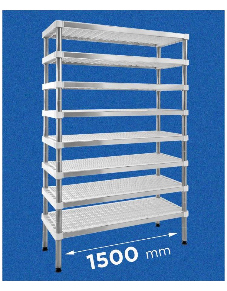 Scaffale per stagionatura formaggi con montanti in acciaio inox e 4 ripiani microforati in polietilene - cm 150x40x180h