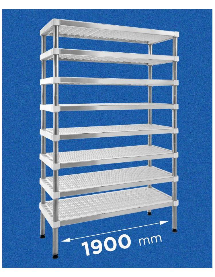 Scaffale per stagionatura formaggi con montanti in acciaio inox e 4 ripiani microforati in polietilene - cm 190x40x180h