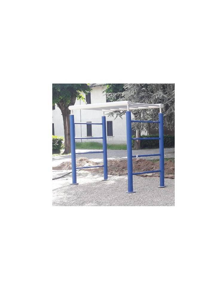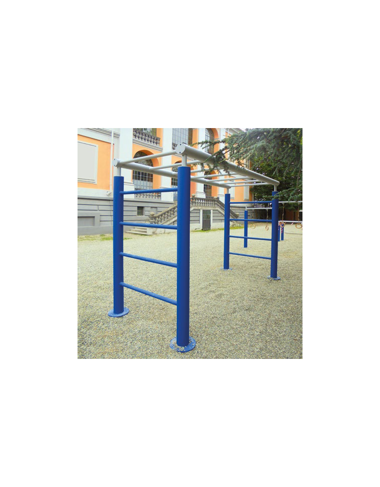 Fitness da esterno – scala orizzontale. Struttura composta da tubolari in acciaio zincato e verniciato. Completa di piastre basi decorative e supporto prolungato per il fissaggio tramite inghisaggio. Attrezzo per rafforzare i muscoli delle dita, della mano e del braccio. Le stazioni fitness del nostro percorso vita sono realizzate per l’utilizzo all’esterno. È possibile acquistare una singola stazione o più per realizzare un percorso che immerso nel verde di parchi o giardini aiuta la nostra salute sia a livello fisico che mentale. Può essere posizionata in parchi pubblici o in camping, all’esterno di ospedali o hotel o, perché no, nelle aree verdi dei grandi condomini. La gamma del nostro fitness da esterno ha varie tipologie di stazioni con esercizi più o meno impegnativi e con obiettivi diversi, dal rafforzamento dei muscoli delle braccia a quelli delle gambe o il rafforzamento degli addominali. Non solo percorsi ma anche stazioni combinate.
