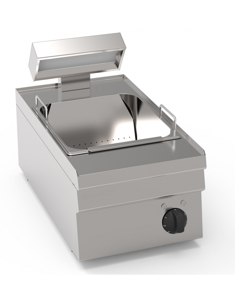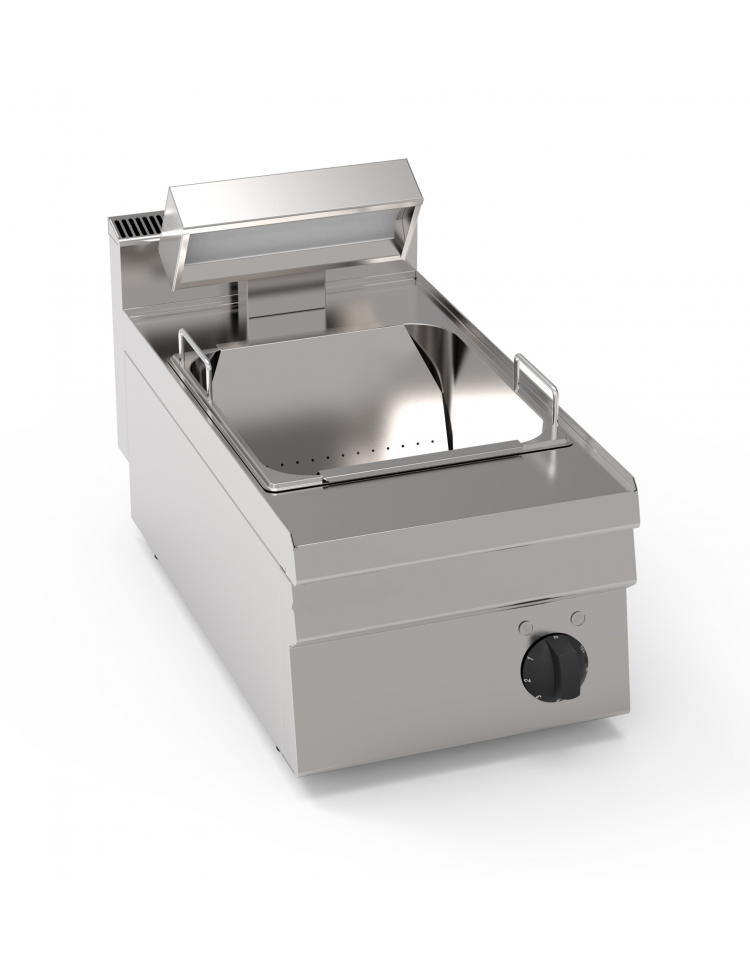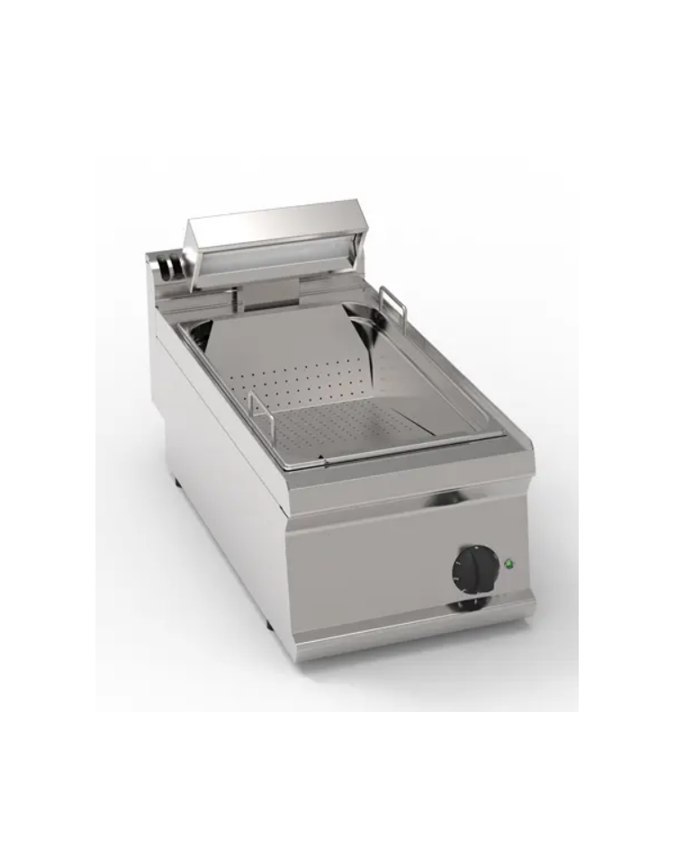 Apparecchiatura ideale per il mantenimento a temperatura calda secca di prodotti fritti (specie patatine, polpette, salsiccie ecc...) senza che questi perdano fragranza e consistenza. Una resistenza con parabola riflettente in ceramica irradia il calore dall’alto, mentre il falso fondo estraibile, forato e sagomato, agevola lo sgocciolamento e la facile raccolta del prodotto. La precisa impostazione della temperatura è assicurata da un regolatore continuo di energia.