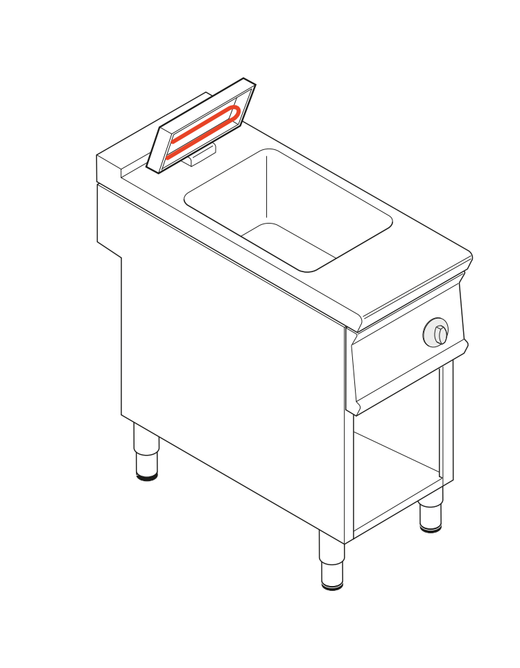 In dotazione bacinella estraibile GN 1/1 H150 mm con falso fondo per lo sgocciolamento dell'olio, entrambi in acciaio inossidabile AISI 304.