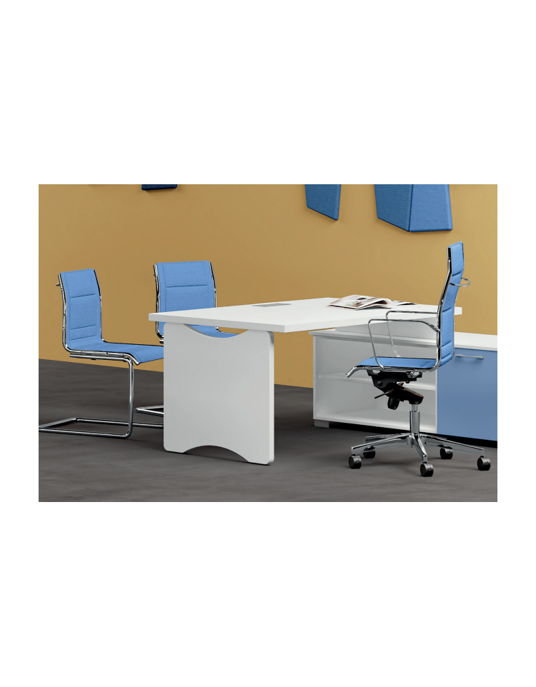Piano lineare retto e fianchi sagomati, realizzati in conglomerato ligneo disponibile spessore 38 mm, nobilitato su entrambe le facce con carte melaminiche certificato FSC, PEFC, Remade in Italy a bassa emissione di formaldeide classe E1, ingifugo in classe 2 di reazione al fuoco (UNI 9177). I fianchi sono collegati ai piani tramite giunzioni metalliche e sono dotati di piedini livellatori in ABS.