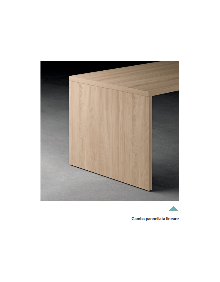 Piano sagomato e fianchi lineari retti realizzati in conglomerato ligneo disponibile spessore 38 mm, nobilitato su entrambe le facce con carte melaminiche certificato FSC, PEFC, Remade in Italy a bassa emissione di formaldeide classe E1, ingifugo in classe 2 di reazione al fuoco (UNI 9177). I fianchi sono collegati ai piani tramite giunzioni metalliche e sono dotati di piedini livellatori in ABS.