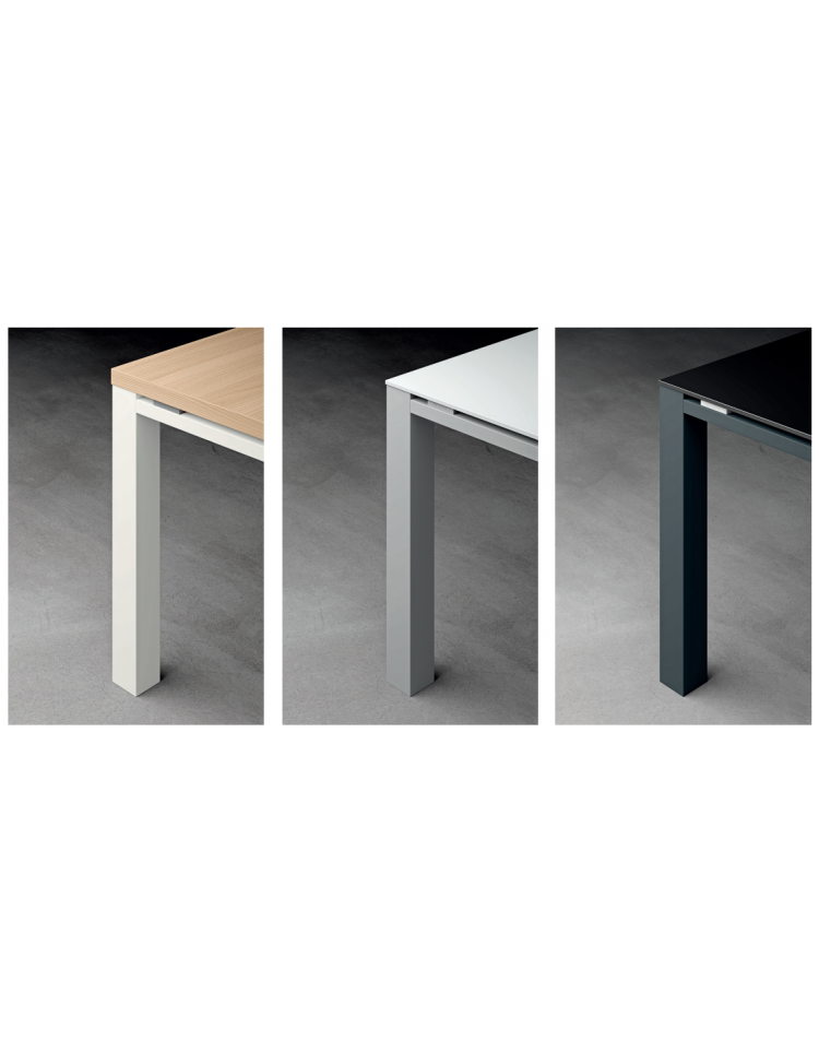Struttura metallica composta da gambe in tubo quadro di sezione 80x80 mm verniciata a polveri epossidiche bianco, grigio o antracite, dotata di piedini livellatori, travi fisse sotto il piano in tubolare metallico quadro 30x30 mm, verniciata a polveri epossidiche grigio. Disponibile eventuale modesty panel anteriore.