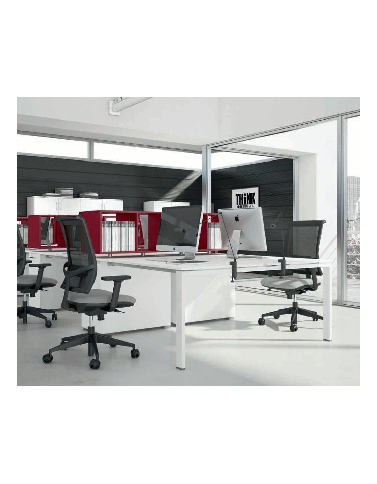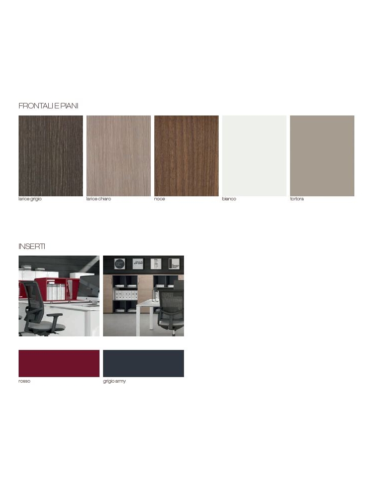 Piani sp. 18 mm realizzati in conglomerato ligneo rivestito in melaminico ad alta resistenza bordati da tutti i lati in ABS sp. 2 mm. La struttura metallica è realizzata in lamiera d’acciaio sp. 1,5 mm verniciata in bianco o grigio. I principali componenti sono: Gamba: Scatolato 70x30 mm ad anello o ad U - Trave da 100 a 180 cm. Lamiera piegata 50xH35 mm. Sulle travi e sulle gambe è possibile agganciare il passacavi per il cablaggio della scrivania. Piano in vetro solo nella misura di 160x80 cm spessore 10 mm. colore rosso o grigio.