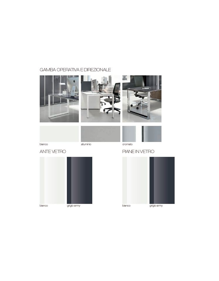 Piani sp. 18 mm realizzati in conglomerato ligneo rivestito in melaminico ad alta resistenza bordati da tutti i lati in ABS sp. 2 mm. La struttura metallica è realizzata in lamiera d’acciaio sp. 1,5 mm verniciata in bianco o grigio. I principali componenti sono: Gamba: Scatolato 70x30 mm ad anello o ad U - Trave da 100 a 180 cm. Lamiera piegata 50xH35 mm. Sulle travi e sulle gambe è possibile agganciare il passacavi per il cablaggio della scrivania.