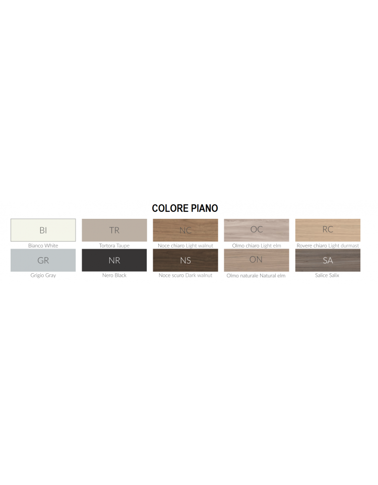 Colori piano : Bianco - Grigio - Tortora - Nero - Noce chiaro - Noce scuro - Olmo chiaro - Olmo naturale - Rovere chiaro - Salice