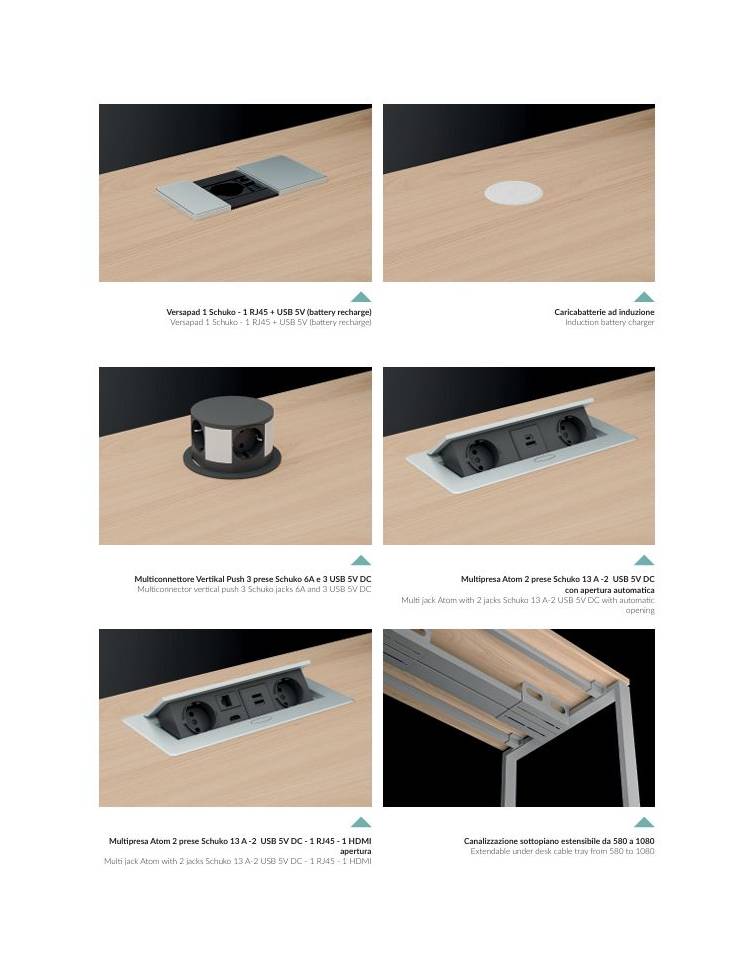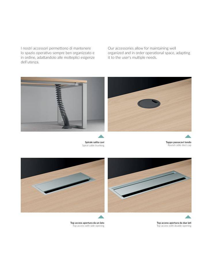 Su tutti gli arredi, ove possibile, possono essere applicati fori passacavi, flap ed elementi di elettrificazione presenti nella sezione “Accessori elettrificazione” della famiglia