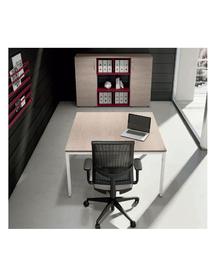 Piani sp. 18 mm realizzati in conglomerato ligneo rivestito in melaminico ad alta resistenza bordati da tutti i lati in ABS sp. 2 mm. La struttura metallica è realizzata in lamiera d’acciaio sp. 1,5 mm verniciata in bianco o grigio. I principali componenti sono: Gamba: Scatolato 70x30 mm ad U - Trave da 100 a 180 cm. Lamiera piegata 50xH35 mm. Sulle travi e sulle gambe è possibile agganciare il passacavi per il cablaggio della scrivania.