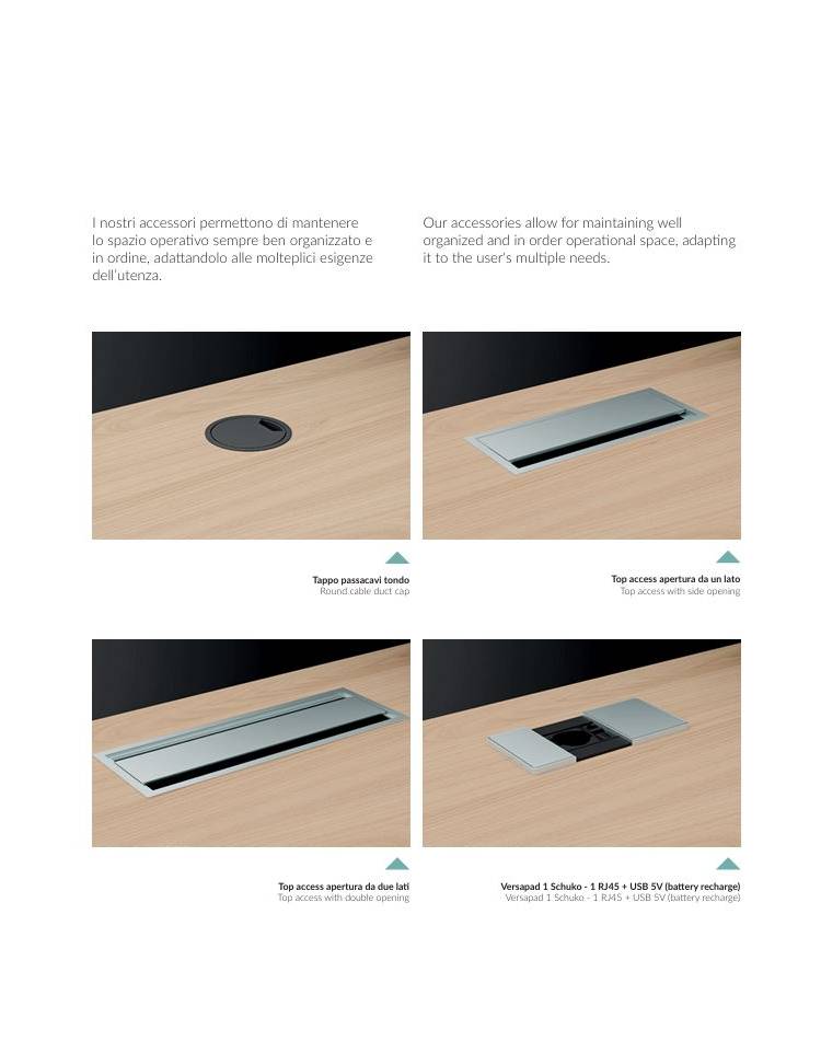 Piani realizzati in conglomerato ligneo, classe E1 di rilascio formaldeide, nello spessore mm 25 e rivestito con carta melaminica ad alta resistenza. Bordi perimetrali in ABS dello stesso colore del piano, spessore mm 2 con spigoli arrotondati secondo le norme antinfortunistiche. Struttura metallica con gambe a “T” rovesciata, fusto verticale in lamiera presso piegata sezione 100x35 con carter interno che permette la salita di eventuali cavi. Trave sotto piano canalizzata, realizzata in lamiera presso piegata sezione 80x35. Travi fissa per i tavoli riunione monoblocco, telescopica per i tavoli riunione composti. Le travi sono verniciate a polveri epossidiche colore grigio, bianco o antracite. Gamboni portanti per raccordi in tubolare sezione 50x50 verniciati a polveri epossidiche colore grigio, bianco o antracite e dotati di piedino livellatore. Modesty panel disponibile per applicazione nelle scrivanie delle varie lunghezze in melaminico sp. mm 18. Gamboni portanti per raccordi, appendici e penisole in tubolare sezione 50x50 verniciati a polveri epossidiche colore grigio, bianco o antracite e dotati di piedino livellatore. Schermi frontali di diverse tipologie sono applicabili, tramite staffe in lamiera piegata e verniciata, al sistema desk.