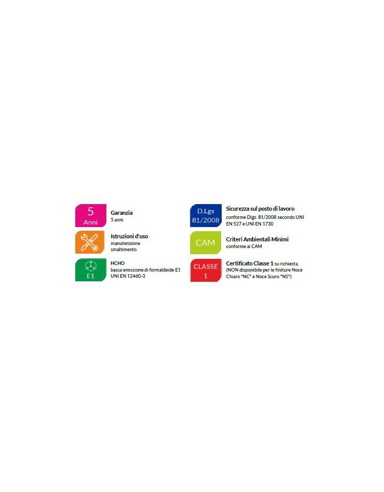 Piano lineare in conglomerato ligneo spessore 25 mm , nobilitato su entrambe le facce con carte melaminiche certificato FSC ,PEFC ,Remade in Italy, con bassa emissione di formaldeide classe E1, ignifugo in classe 2 di reazione al fuoco (UNI 9177). | Bordi perimetrali in ABS dello stesso colore del piano ,spessore mm 2 con spigoli arrotondati secondo le norme anti-infortunistiche.