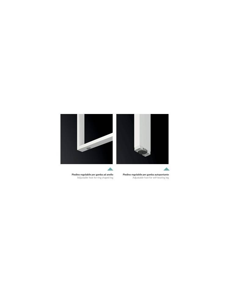 Struttura metallica con gambe ad “Anello chiuso” realizzata in tubo di acciaio sezione 70x30 e dotata di distanziali in nylon in tinta con la struttura. La struttura è verniciata a polveri epossidiche colore grigio, bianco o antracite