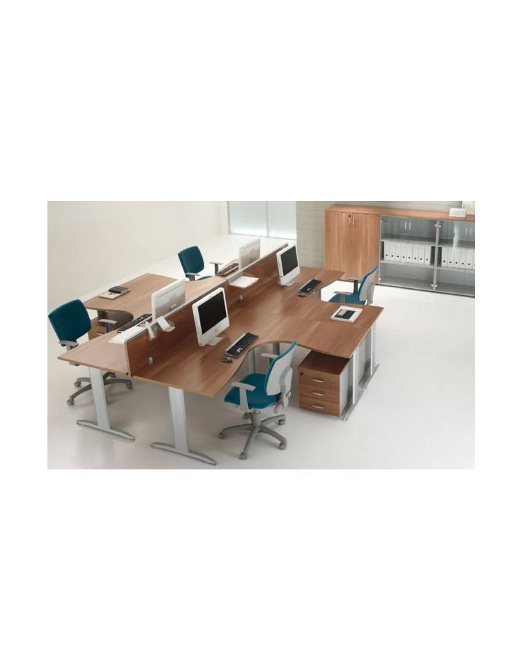 Piani realizzati in conglomerato ligneo, classe E1 di rilascio formaldeide, nello spessore mm 25 e rivestito con carta melaminica ad alta resistenza. Bordi perimetrali in ABS dello stesso colore del piano, spessore mm 2 con spigoli arrotondati secondo le norme antinfortunistiche. Struttura metallica con gambe a “T” rovesciata, fusto verticale in lamiera presso piegata sezione 100x35 con carter interno che permette la salita di eventuali cavi. Trave sotto piano canalizzata, realizzata in lamiera presso piegata sezione 80x35. Travi fissa per i tavoli riunione monoblocco, telescopica per i tavoli riunione composti. Le travi sono verniciate a polveri epossidiche colore grigio, bianco o antracite. Gamboni portanti per raccordi in tubolare sezione 50x50 verniciati a polveri epossidiche colore grigio, bianco o antracite e dotati di piedino livellatore. Modesty panel disponibile per applicazione nelle scrivanie delle varie lunghezze in melaminico sp. mm 18.
