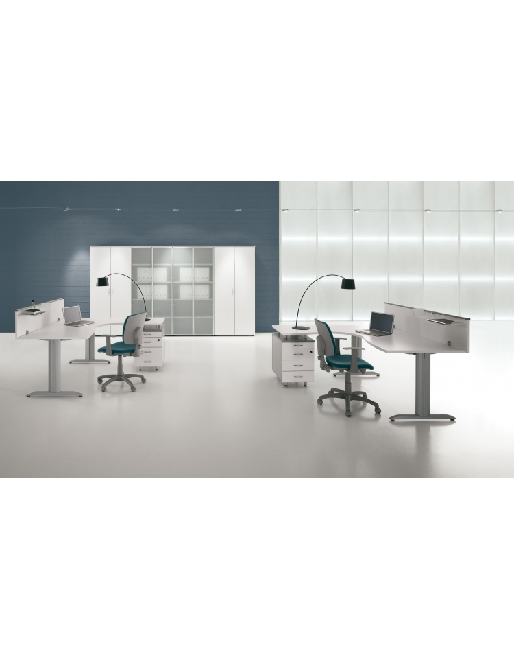 Piani realizzati in conglomerato ligneo, classe E1 di rilascio formaldeide, nello spessore mm 25 e rivestito con carta melaminica ad alta resistenza. Bordi perimetrali in ABS dello stesso colore del piano, spessore mm 2 con spigoli arrotondati secondo le norme antinfortunistiche. Struttura metallica con gambe a “T” rovesciata, fusto verticale in lamiera presso piegata sezione 100x35 con carter interno che permette la salita di eventuali cavi. Trave sotto piano canalizzata, realizzata in lamiera presso piegata sezione 80x35. Travi fissa per i tavoli riunione monoblocco, telescopica per i tavoli riunione composti. Le travi sono verniciate a polveri epossidiche colore grigio, bianco o antracite. Gamboni portanti per raccordi in tubolare sezione 50x50 verniciati a polveri epossidiche colore grigio, bianco o antracite e dotati di piedino livellatore. Modesty panel disponibile per applicazione nelle scrivanie delle varie lunghezze in melaminico sp. mm 18.