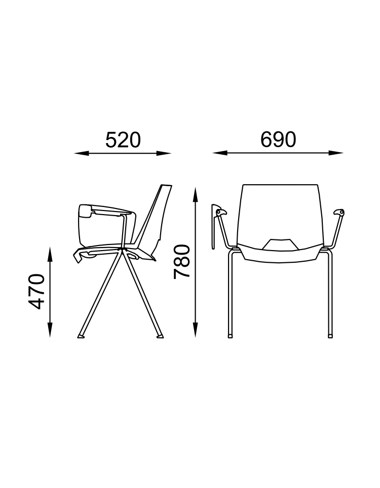 Sedia fissa monoscocca in polipropilene con telaio a 4 gambe in acciaio cromato, braccioli e tavoletta - Sedile imbottito