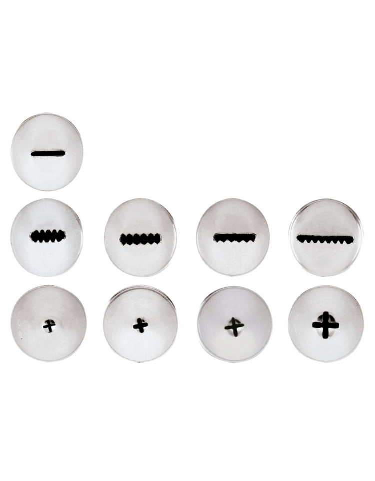 Set 9 bocchette per decorazione in acciaio inox unipezzo fori liscio, seghettato e croce - diametro base mm 18
