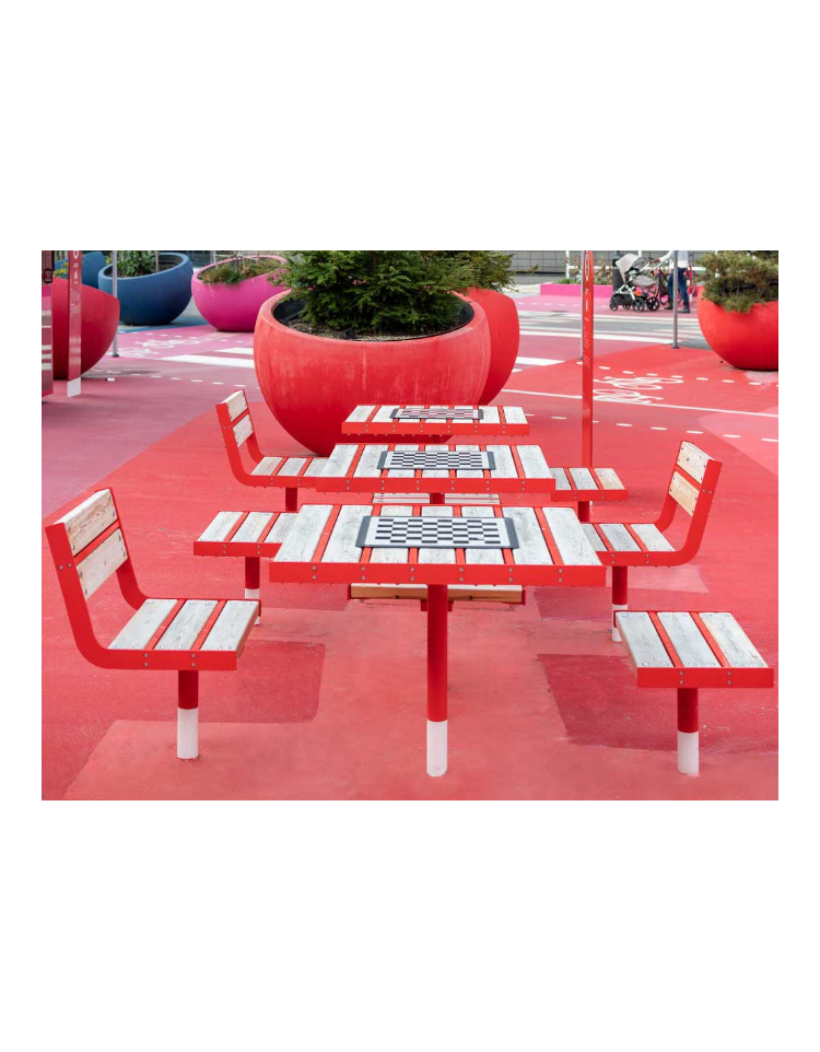 Set composto da tavolo e due sedie con schienale. Struttura portante in tubolare in acciaio zincato e verniciato nelle varie colorazioni RAL. Nella parte inferiore sono saldate le piastre base per poter fissare il set al suolo con tasselli ad espansione. Nella parte superiore sono saldate le piastre dove andranno fissate le doghe in legno. La seduta ed il piano del tavolo sono formati da doghe in legno di pino. Per dare stabilità alla seduta centralmente è fissato tramite viti un rinforzo. Viteria in acciaio inox. Elegante e moderno si integra bene sia con il classico che con il moderno. Scacchiera non inclusa nel prezzo.