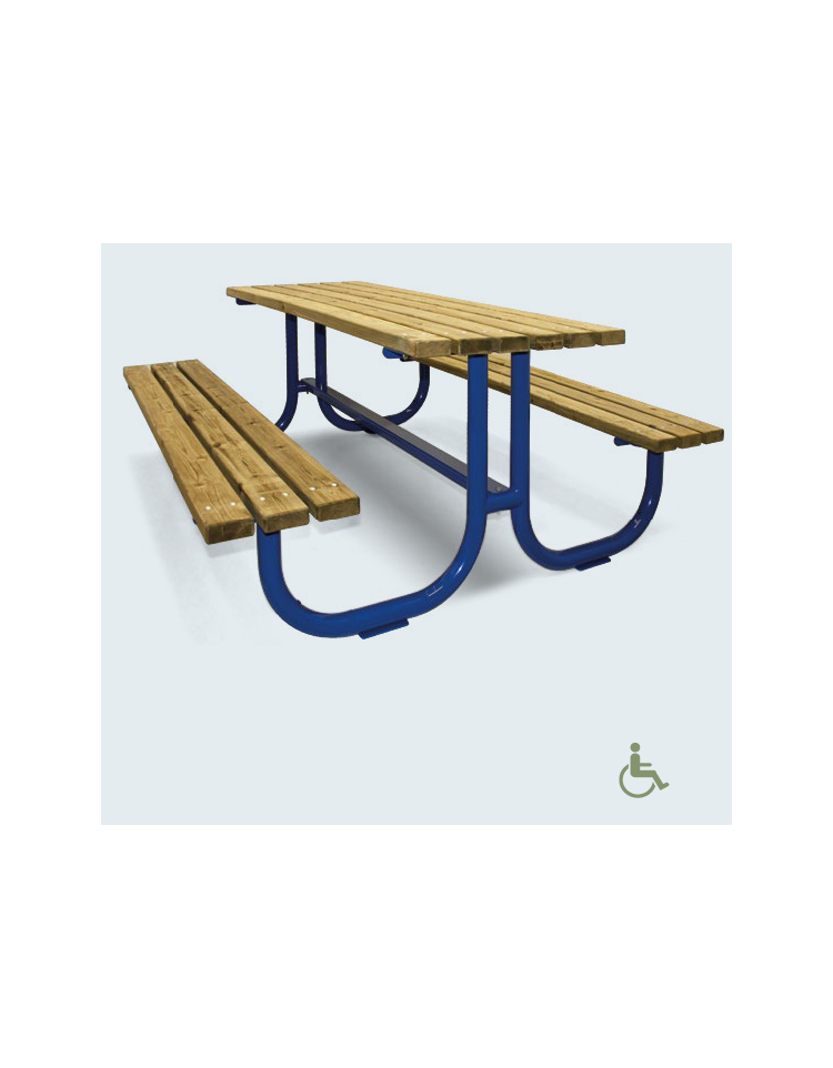 Set dal design semplice, adatto al posizionamento all’esterno, in camping o parchi pubblici, aree verdi, lungo piste ciclabili o pedonali, composto da un tavolo e due panchine piane. Il set è composto da una struttura in acciaio zincato e verniciato a polveri poliestere termoindurenti nelle diverse colorazioni RAL. Formato da due supporti laterali in tubolare tondo collegati tra loro da un tirante. Ai fianchi vengono saldate 4 piastre con fori per il fissaggio al suolo tramite tasselli. La seduta ed il piano del tavolo sono composti da doghe di legno in pino nordico trattate con preservante in autoclave.