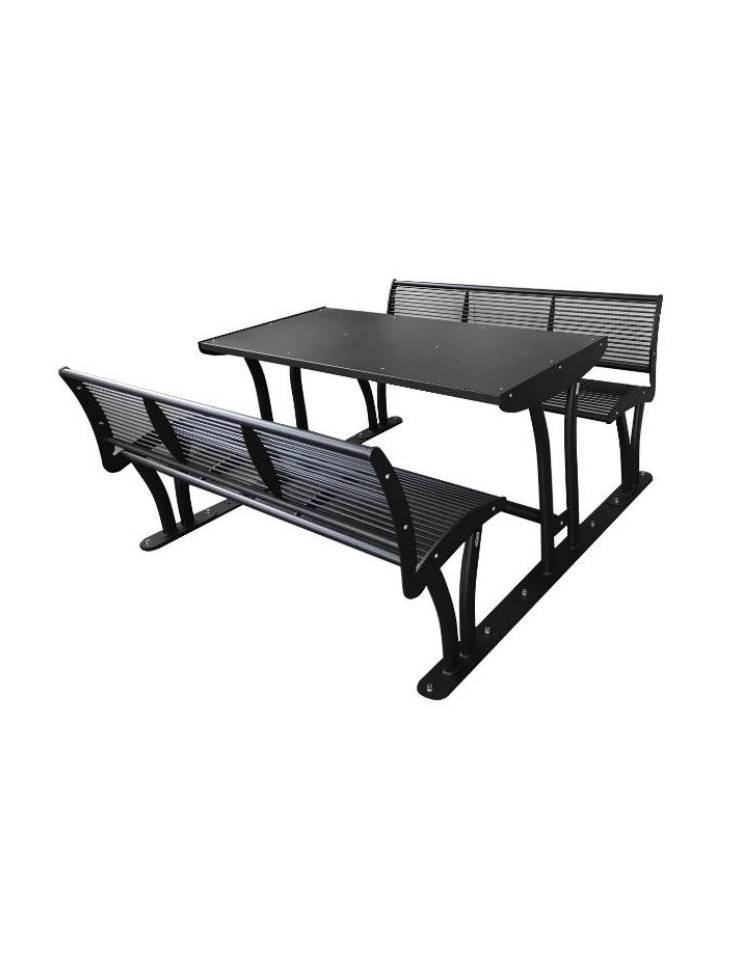 Set realizzato in acciaio zincato e verniciato, nelle diverse colorazioni RAL. Composto da 1 tavolo + 2 panchine con schienale. Il telaio del tavolo è costruito mediante assemblaggio di lamiere e profilati opportunamente sagomati per crearne l’adeguata solidità e consentire il fissaggio di una lamiera che funge da pianale del tavolo stesso. Il tutto, su richiesta, può essere integrato con una guida di collegamento che consenta di fissare tutti gli elementi nella posizione corretta per formare il set ed eventualmente tassellarlo al suolo (prezzo a parte).