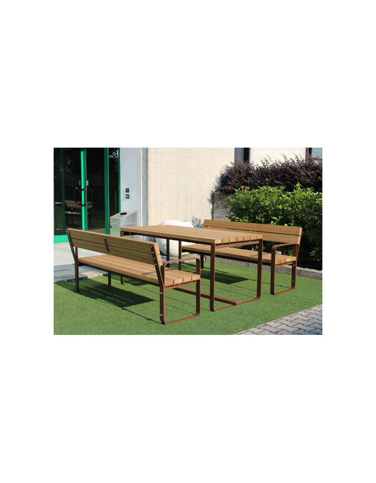 Set con struttura portante in acciaio zincato e verniciato nelle varie colorazioni RAL. I fianchi del tavolo e delle panchine sono costituiti da due robuste spalle laterali in piatto opportunamente piegato, saldato e forato per poter fissare la struttura al suolo con tasselli ad espansione. Nella parte superiore dei supporti ci sono gli appositi fori per il fissaggio delle doghe in legno. Le sedute ed il piano del tavolo sono formati da doghe in legno di pino. La viteria è interamente in acciaio inox.