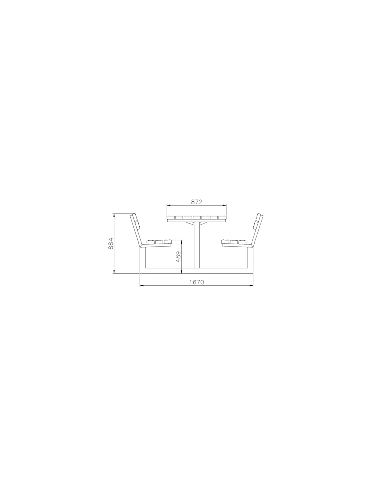 Set composto da un tavolo e due panchine con schienale. Il set è composto da una struttura in acciaio zincato e successivamente verniciato a polveri epossidiche formata da due supporti laterali in tubolare collegati tra loro da tre tiranti. Ai fianchi sono saldate 4 piastre con fori per il fissaggio al suolo tramite tasselli. La struttura montata diventa corpo unico per evitare che gli utenti spostino a piacere gli elementi. La seduta ed il piano del tavolo sono composti da doghe di legno di pregio.