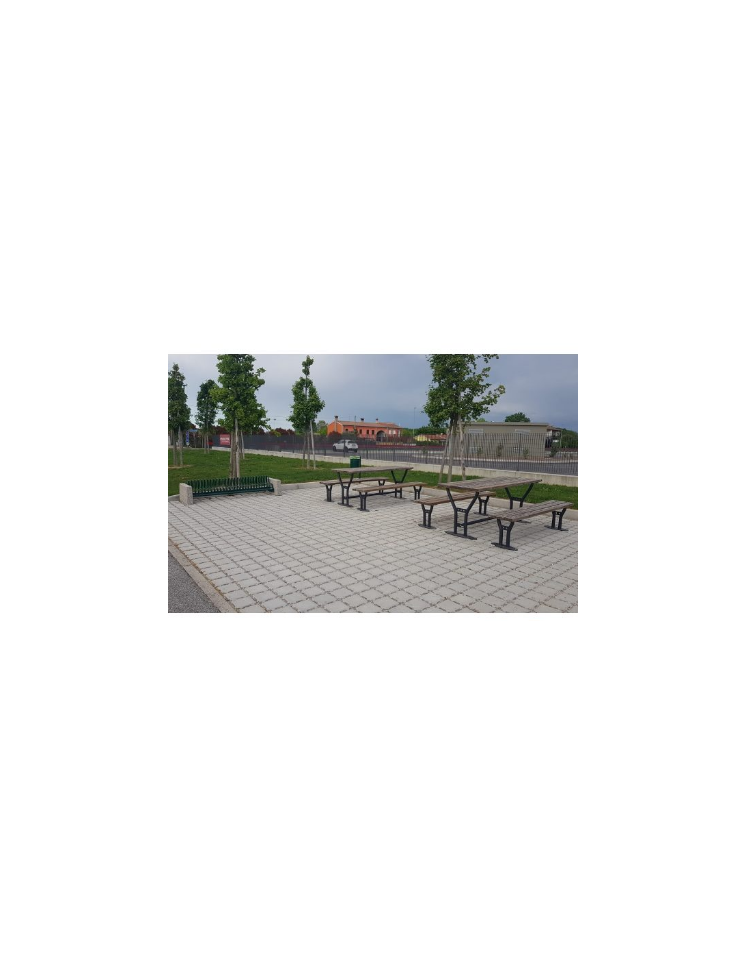 Set composto da un tavolo e due panchine stile “pic-nic” acquistabili anche singolarmente. Il tavolo è composto da una struttura in acciaio zincato e verniciato a polveri epossidiche formata da due gambe sagomate in tubolare che poggiano su una base di forma ellittica tassellabile al suolo e sulla parte superiore da un piatto sul quale vengono fissate con bulloneria in acciaio le 6 doghe di legno di pregio che compongono il piano d’appoggio del tavolo stesso. La 2 coppie di gambe del tavolo sono collegate tra loro da un tirante centrale in tubo tondo a 15cm dal suolo che funge anche da poggiapiedi. Le due panchine correlate hanno le stesse caratteristiche del tavolo con base ellittica e 3 doghe in legno. Su richiesta possono essere concordate differenti colorazioni RAL della struttura. Tavolo e panchine molto robuste adatte a parchi e boschi. Il set è fornito montato o in confezione da assemblare.