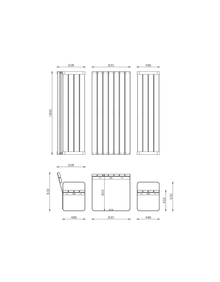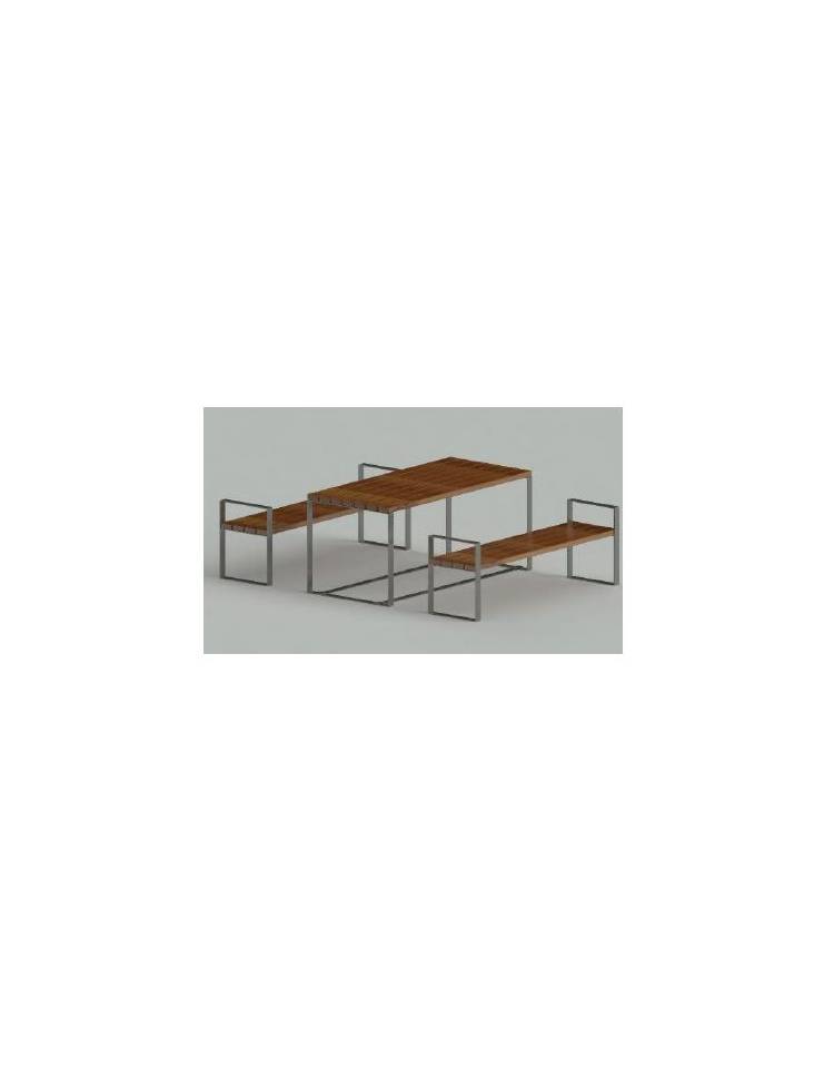 Set con struttura portante in acciaio zincato e verniciato nelle varie colorazioni RAL. I fianchi del tavolo e delle panchine sono costituiti da due robuste spalle laterali in piatto opportunamente piegato, saldato e forato per poter fissare la struttura al suolo con tasselli ad espansione. Nella parte superiore dei supporti ci sono gli appositi fori per il fissaggio delle doghe in legno. Le sedute ed il piano del tavolo sono formati da doghe in legno di pregio. La viteria è interamente in acciaio inox.