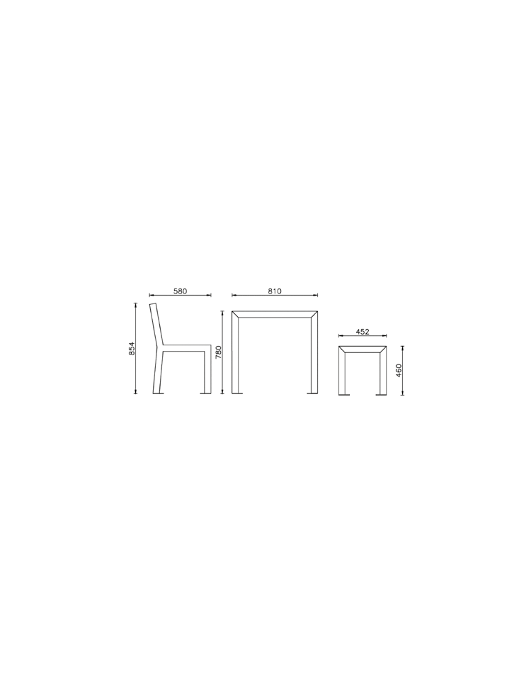 Set con tavolo + 4 sedie con schienale. Set acciaio-legno costituito da sostegni laterali in tubolare predisposti per il tassellamento al suolo, mentre nella parte superiore viene saldata una piastra per il fissaggio delle tavole. La seduta piana è formata da 9 doghe in legno di pregio trattato fissate su supporti in piatto. Sulla seduta è inoltre fissato un rinforzo centrale per dare maggiore stabilità e linearità alle tavole. Il tavolo ha le stesse caratteristiche della panchina, il piano è formato da 16 doghe. Le parti metalliche sono zincate e verniciate nelle varie colorazioni RAL. La viteria è in acciaio inox.