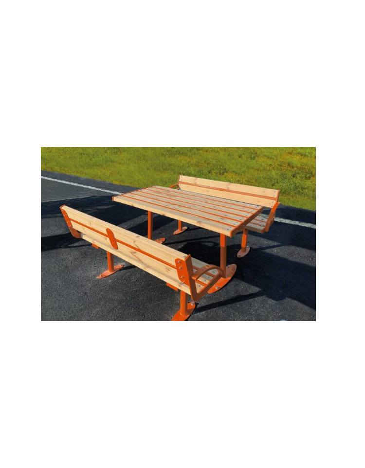 Set composto da tavolo accessibile e due panchine con schienale. Struttura portante in tubolare in acciaio zincato e verniciato nelle varie colorazioni RAL. Nella parte inferiore sono saldate le piastre base per poter fissare il set al suolo con tasselli ad espansione. Nella parte superiore sono saldate le piastre dove andranno fissate le doghe in legno. La seduta ed il piano del tavolo sono formati da doghe in legno di pregio. Per dare stabilità alla seduta centralmente è fissato tramite viti un rinforzo. Viteria in acciaio inox. Elegante e moderno si integra bene sia con il classico che con il moderno.