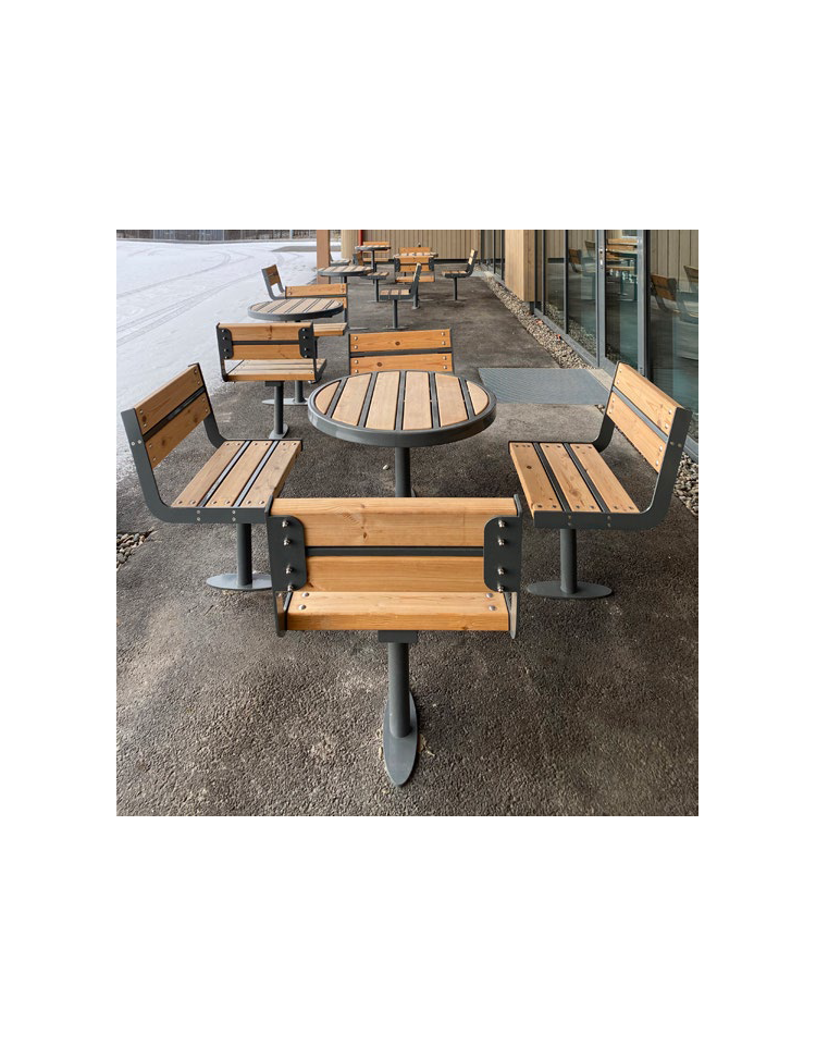 Set composto da tavolo tondo di diametro cm 110 e due sedie da cm 60 con schienale. Struttura portante in tubolare in acciaio zincato e verniciato nelle varie colorazioni RAL. Nella parte inferiore sono saldate le piastre base per poter fissare il set al suolo con tasselli ad espansione. Nella parte superiore sono saldate le piastre dove andranno fissate le doghe in legno. La seduta ed il piano del tavolo sono formati da doghe in legno di pregio. Per dare stabilità alla seduta centralmente è fissato tramite viti un rinforzo. Viteria in acciaio inox. Elegante e moderno si integra bene sia con il classico che con il moderno.