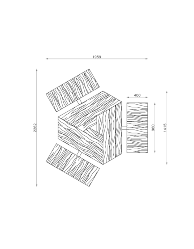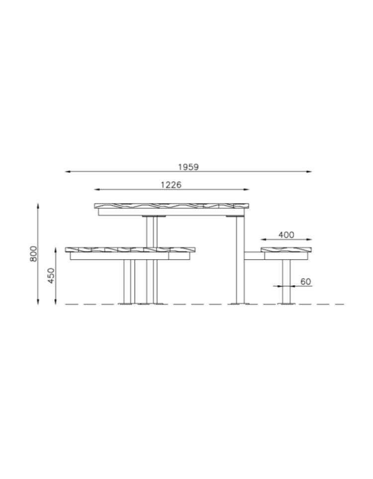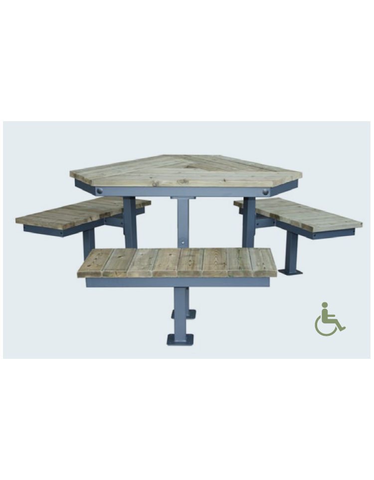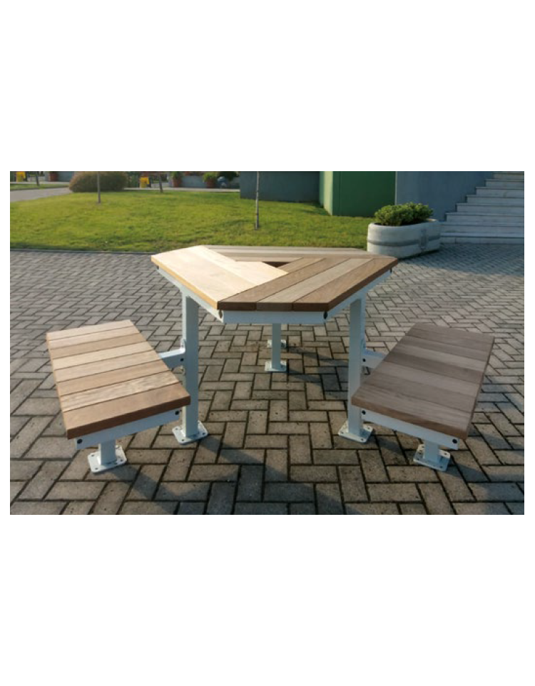Set composto da un tavolo e tre panchine piane. Il set è composto da una struttura in acciaio zincato e successivamente verniciata a polveri epossidiche formata da tre supporti in tubolare quadro collegati al piano del tavolo tramite viti. Ai fianchi vengono saldate 6 piastre con fori per il fissaggio al suolo tramite tasselli, la struttura montata diventa corpo unico per evitare che gli utenti spostino a piacere gli elementi. La seduta ed il piano del tavolo sono composti da doghe in legno di pregio. Set adatto anche per le persone diversamente abili.