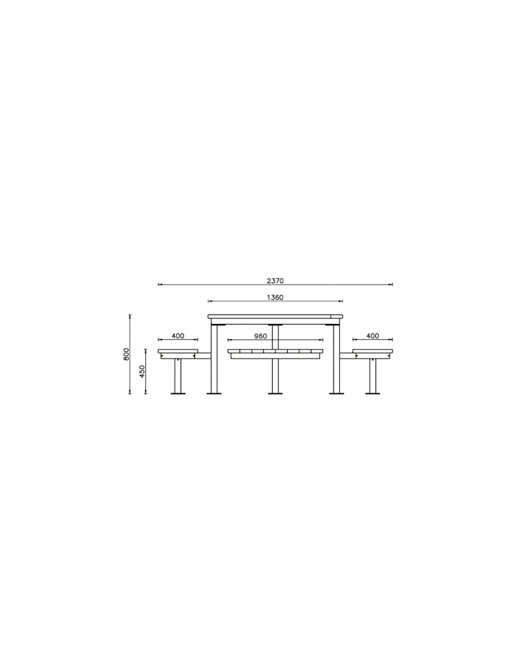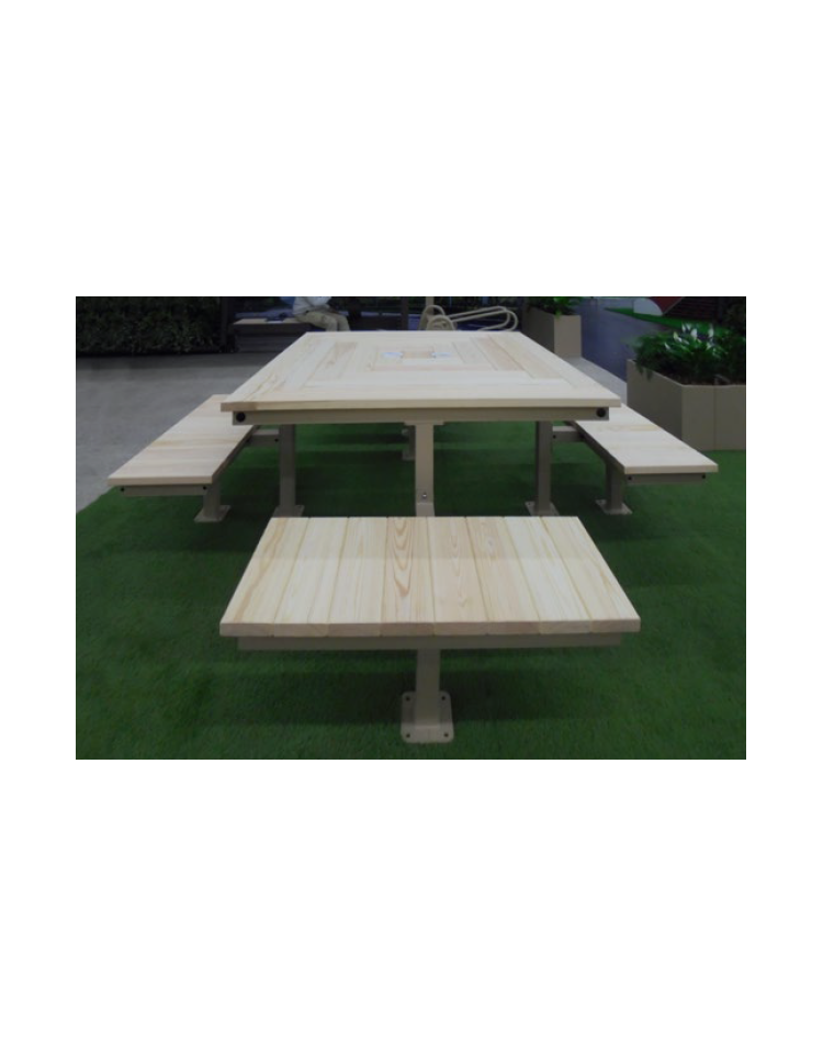 Set composto da un tavolo quadrato e quattro panchine piane. Il set è composto da una struttura in acciaio zincato e successivamente verniciata a polveri epossidiche formata da tre supporti in tubolare quadro collegati al piano del tavolo tramite viti. Ai fianchi vengono saldate 6 piastre con fori per il fissaggio al suolo tramite tasselli, la struttura montata diventa corpo unico per evitare che gli utenti spostino a piacere gli elementi. La seduta ed il piano del tavolo sono composti da doghe in legno di pino. Set adatto anche per le persone diversamente abili.